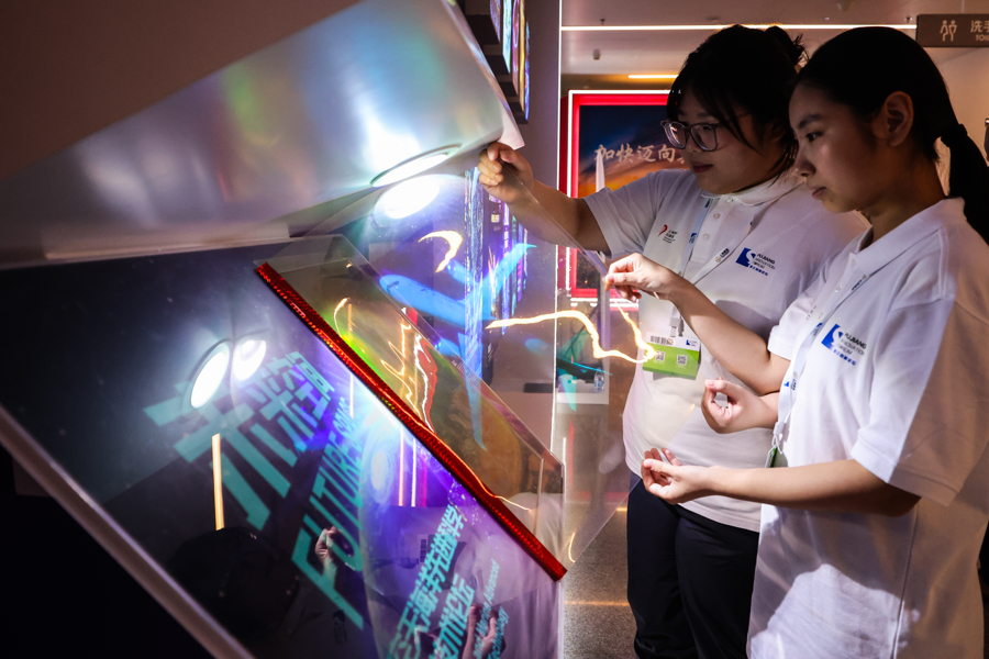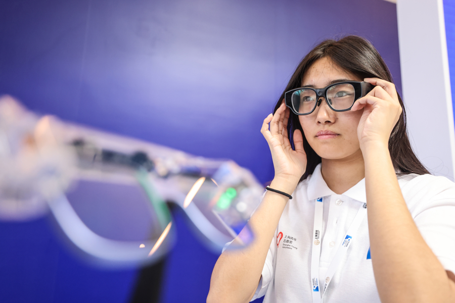在2025浦江创新论坛“预见未来展示区”,观众正在体验一款AR几何光波导镜片,可实时感受AI增强的3D空间智能视觉。