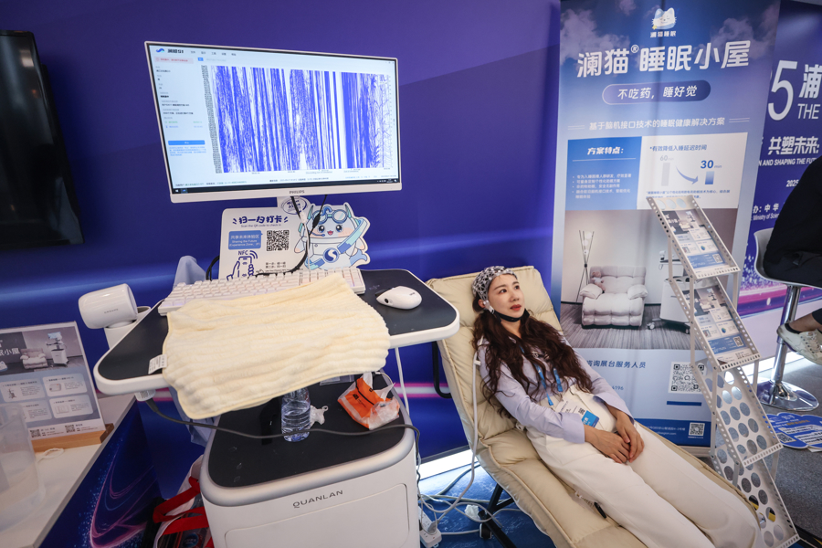 在2025浦江创新论坛“共享未来体验区”,观众正在体验一款上海全澜科技带来的睡眠障碍治疗仪。