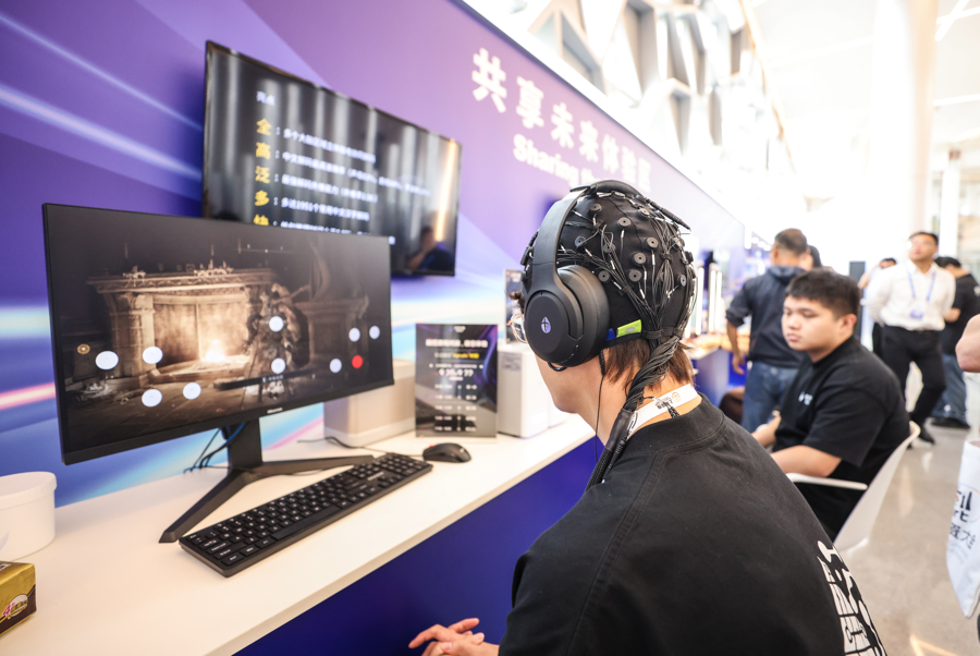 在2025浦江创新论坛“共享未来体验区”,上海岩思类脑人工智能研究院的“非侵入式脑机接口玩游戏”项目,邀体验者戴上脑电采集帽,不用鼠标,凭意念玩《黑神话:悟空》。经过10分钟训练,体验者可掌握这种脑控技巧——看着屏幕上的8个虚拟按键,想着按哪个键、出哪个招,就能丝滑地操控“天命人”与妖怪对战。