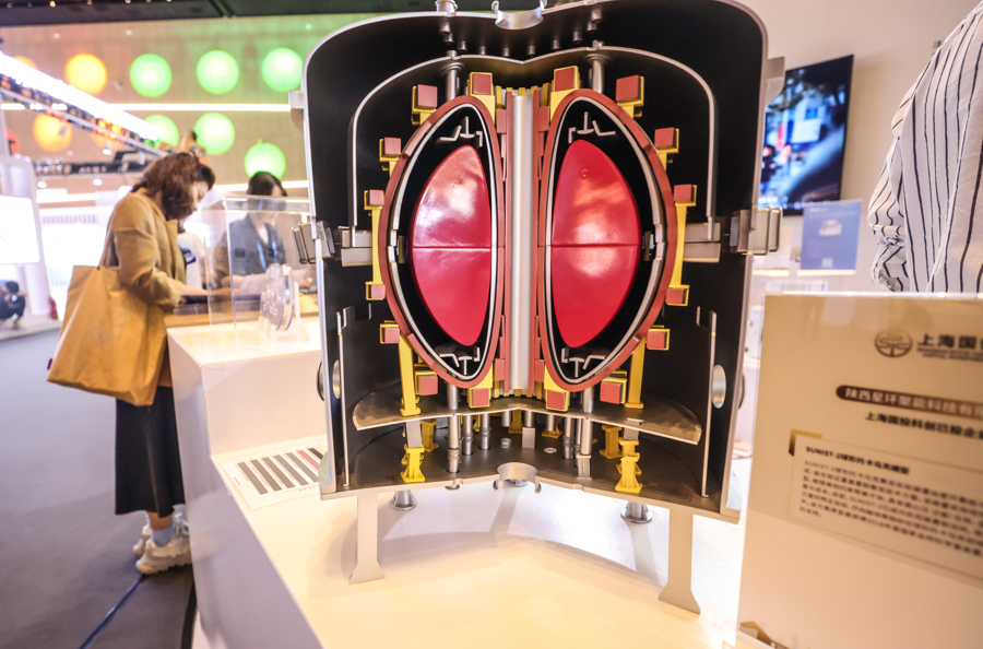 可控核聚变是上海重点布局的未来产业之一,多条技术路线的聚变能源项目正在加快推进。图为上海国投展位展出的SUNIST-2球形托卡马克模型。