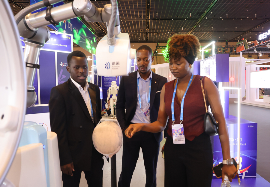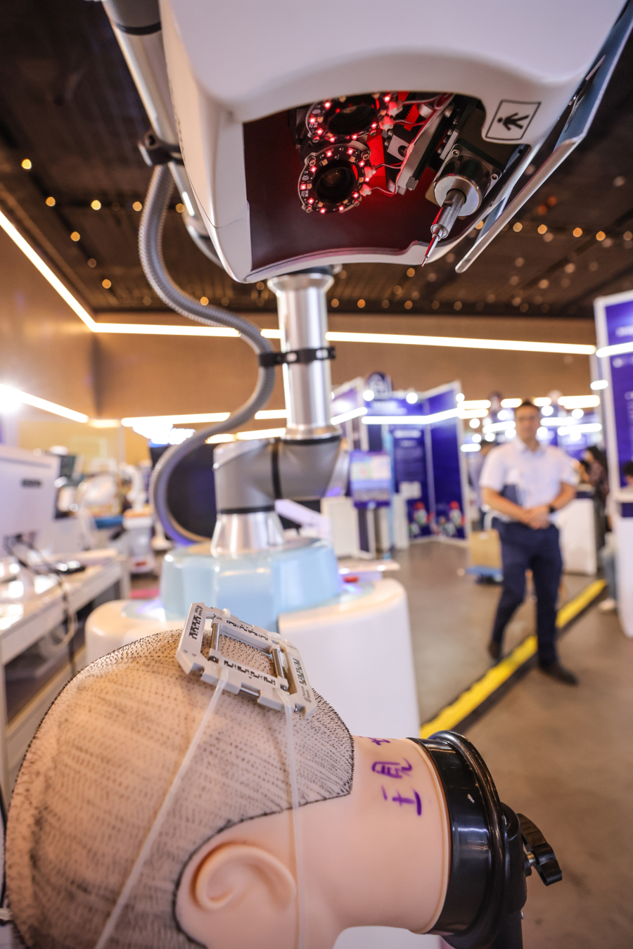 来自津巴布韦的AI创业团队成员正在现场观看一款智能植发机器人。