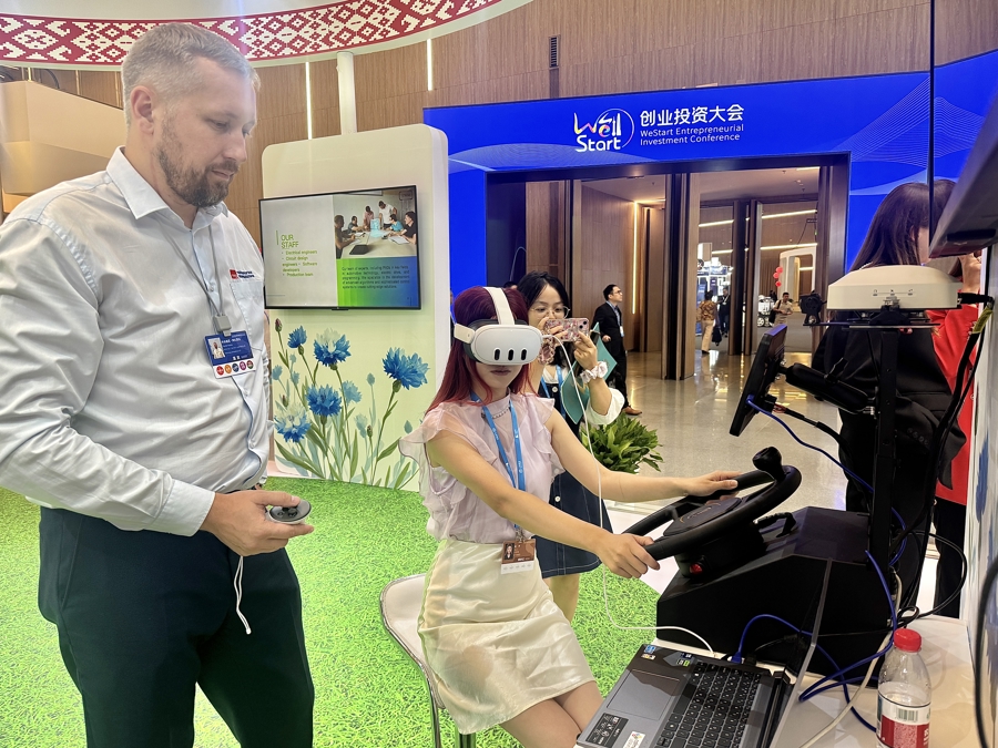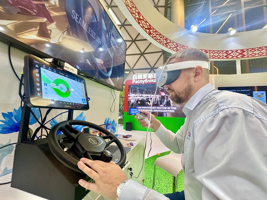 在主宾国白俄罗斯展区,工作人员正在指导观众体验一款拖拉机自动驾驶系统。